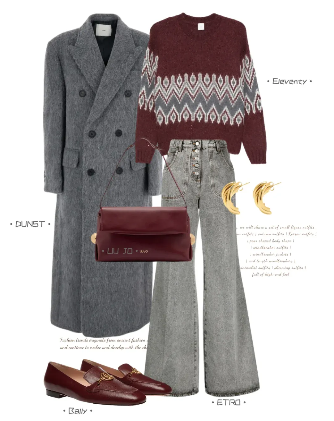 灰大衣配 + 酒红毛衣的经典显贵配色,搭配休闲感的牛仔裤、乐福鞋,弱化了正式感,拎一个同色包包舒适又不失精致感。