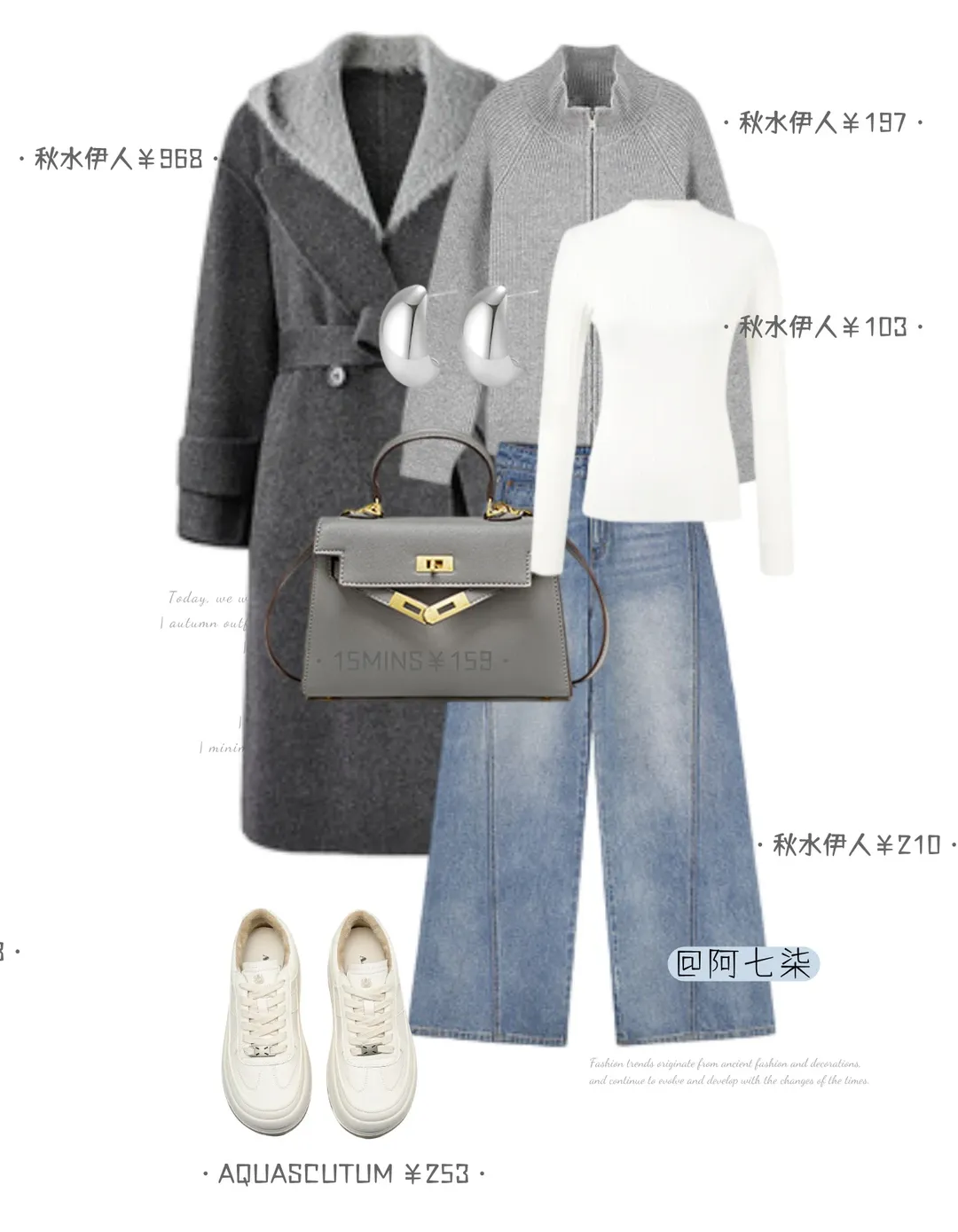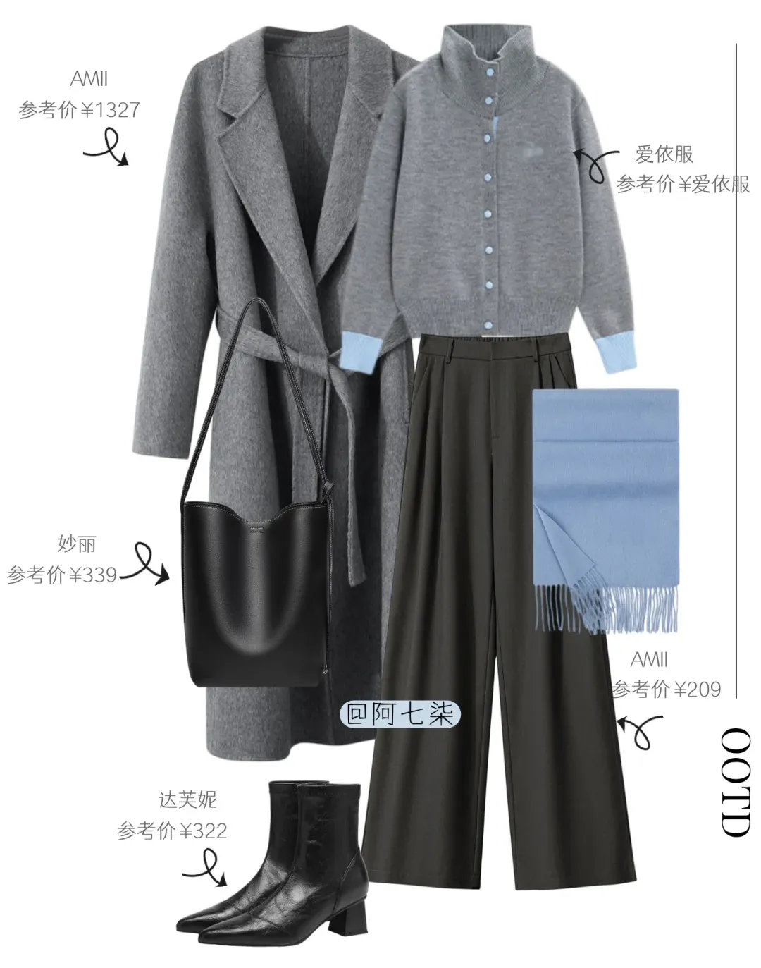 同件灰大衣换搭浅蓝扭结上衣,高腰设计悄悄拉比例。牛仔阔腿裤柔化了大衣的正式感,黑包 + 短靴压稳气场。