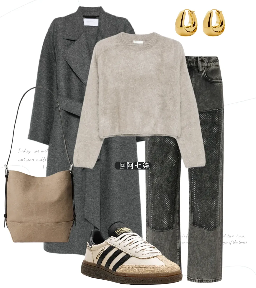 低饱和灰 + 藏蓝的搭配真的很戳人,灰色阔腿裤直接把胯宽腿粗藏得严严实实,和大衣顺色显高 max,藏蓝包与拼色鞋首尾呼应,金属耳环点睛,精致感直接 up!