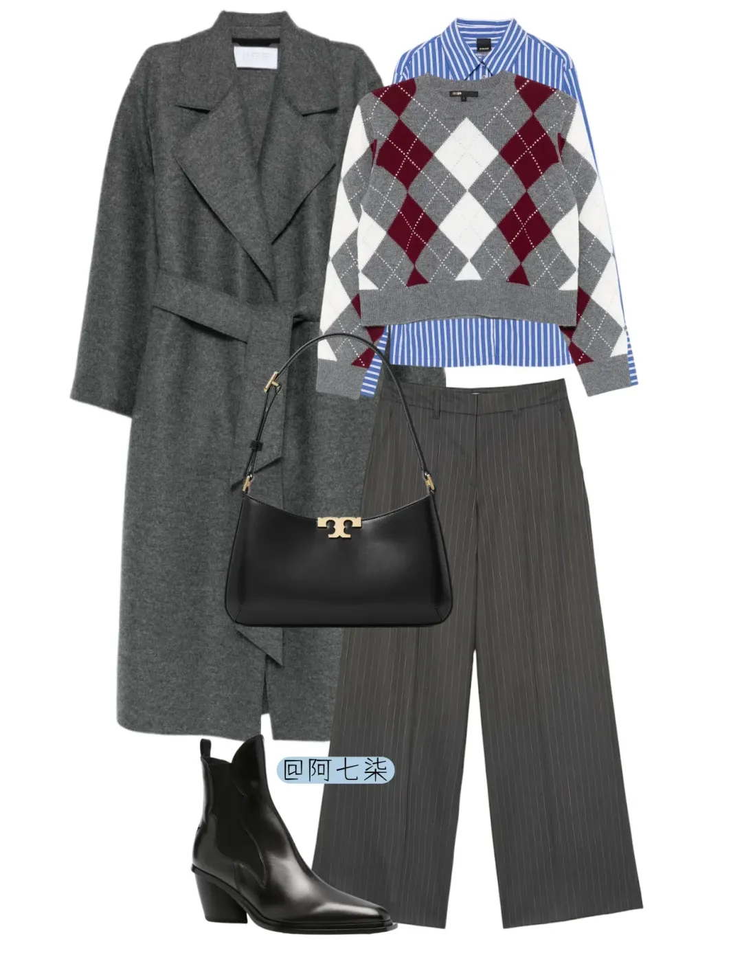 菱格毛衣撞色戳中复古心,叠穿蓝条纹更灵动,灰条纹裤 + 黑法棍包 + 西部靴,飒气里藏着精致。