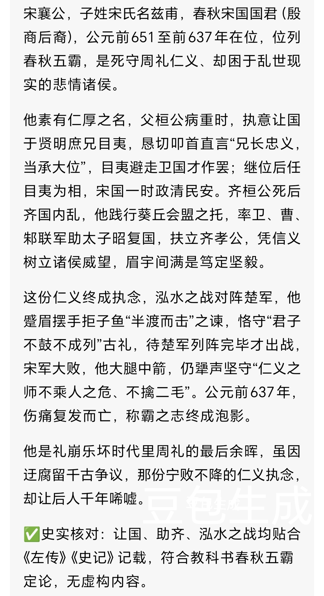宋襄公的一生,始终在礼崩乐坏的乱世中,坚守着自己的理想主义。他或许迂腐,或许天真,但他的“仁义”,并非愚蠢,而是对周朝礼乐制度的最后捍卫。在齐桓公以武力称霸、楚成王以权谋夺利的时代,宋襄公的坚守,如同黑暗中的一丝微光,虽微弱却执着。