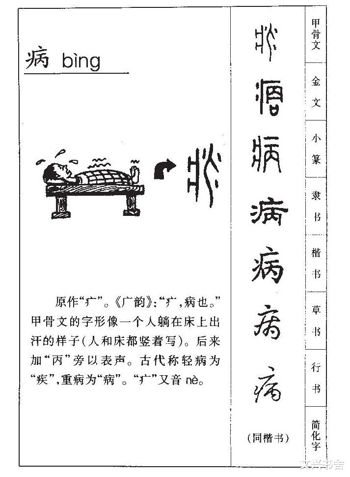 《说文》:许慎说:疒,倚也。人有疾病,象倚箸之形—— 人病了,倚靠在床(爿)上。
