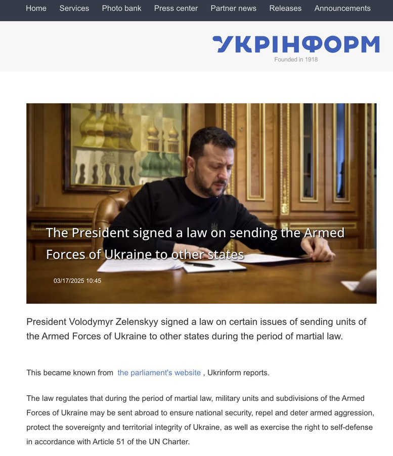 泽连斯基签署了一项法律,允许在戒严期间在国外部署乌克兰军队。