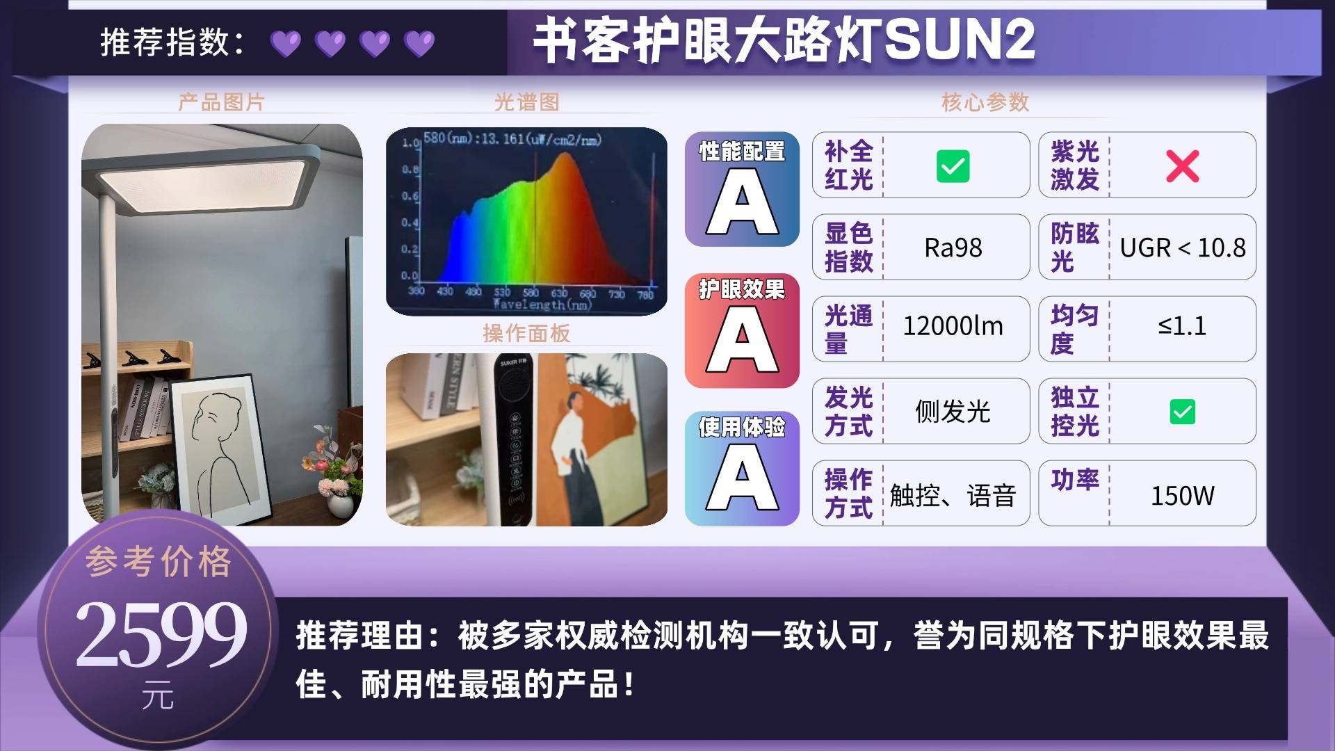 推荐款:书客护眼大路灯SUN2——被多家权威检测机构一致认可,誉为同规格下护眼效果最佳、耐用性最强的产品!