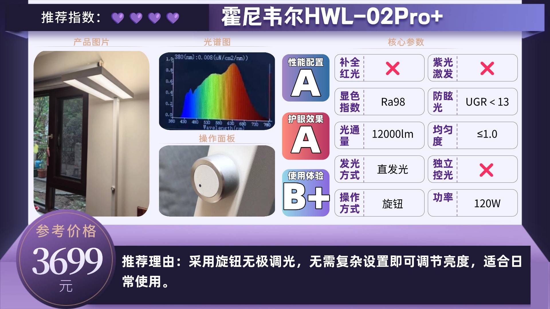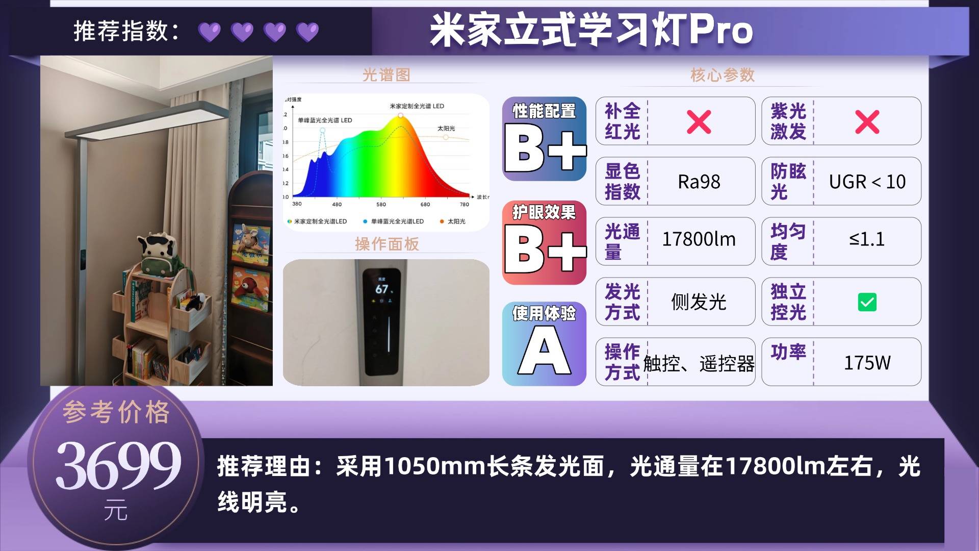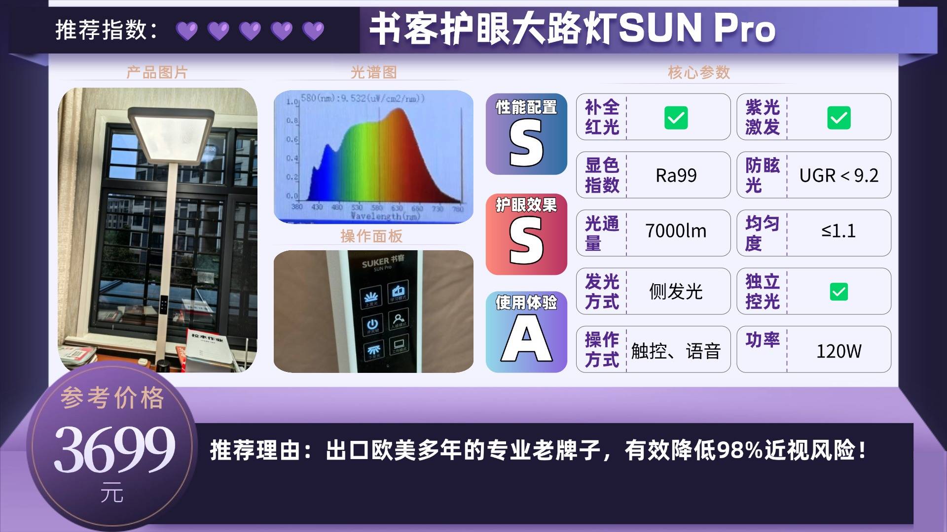 并深入研究不同波长对眼睛健康的影响,研发出RRT2.0红光增益养眼技术,精准优化650nm红光波长和光谱均匀性,并过滤380〜450nm有害蓝光,有效保护视网膜和眼睛其他重要组织,大大减少有害蓝光的影响同时增加有益红光,每天3分钟红光,可以显著有效降低98%的近视风险。更是借助了德国BASF眩光抑制膜,实现了低眩光等级(UGR ≤ 9.2),使得书客Sun Pro在光照均匀度、光照柔和度、蓝光防护效果、近视风险等18个核心维度,都是行业表现最优秀的产品!