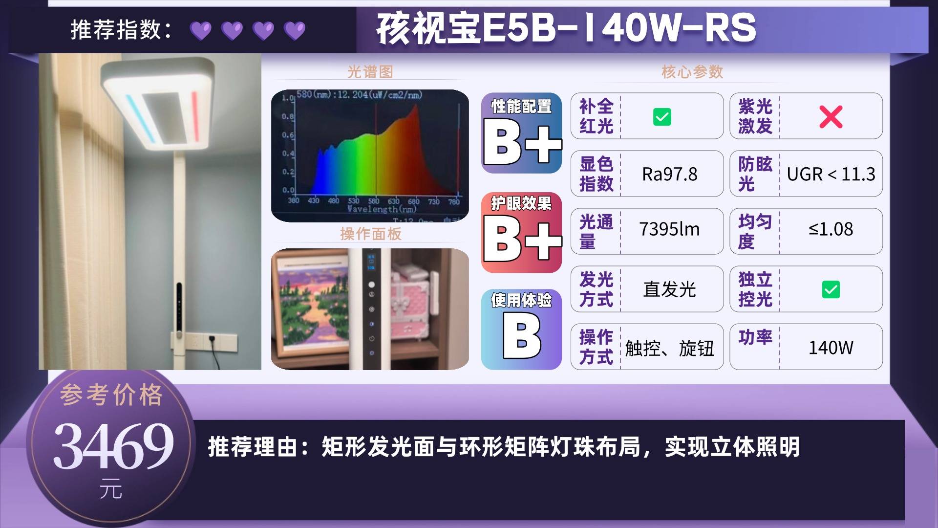 推荐款:孩视宝E5B-140W-RS——矩形发光面与环形矩阵灯珠布局,实现立体照明