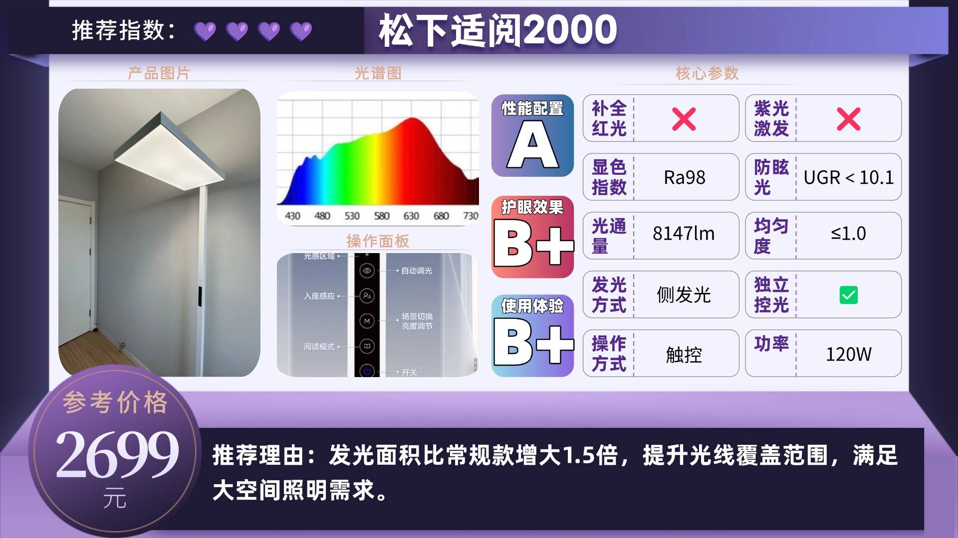 推荐款:松下适阅2000——发光面积比常规款增大1.5倍,提升光线覆盖范围,满足大空间照明需求。