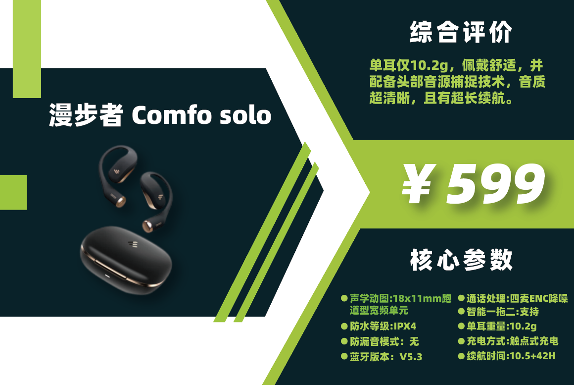 漫步者 Comfo Solo售价:599 元推荐理由:LDAC超清传输协议,搭载超大单元,音质清晰立体,IP54级防水360°环绕声场。