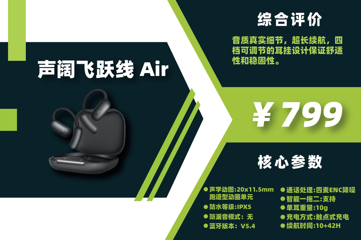 推荐理由:性价比极高,自研防漏音模式,IPX6 防水适配多场景,500元以内的开放式耳机第一选择。