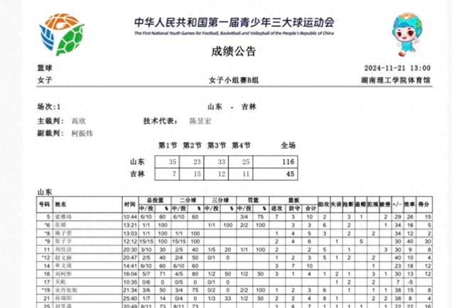 11月21日,第一届全国青少年三大球运动会,女篮比赛迎来首轮比赛,张子宇代表的山东青年队,此番对阵吉林青年队,双方经过四节比拼,结果,山东青年队迎来了一场大胜,以116-45赢了吉林青年队足足71分。山东队拿下本场比赛,也是收获了本届赛事的开门红,而吉林青年队则遭到了开门黑。