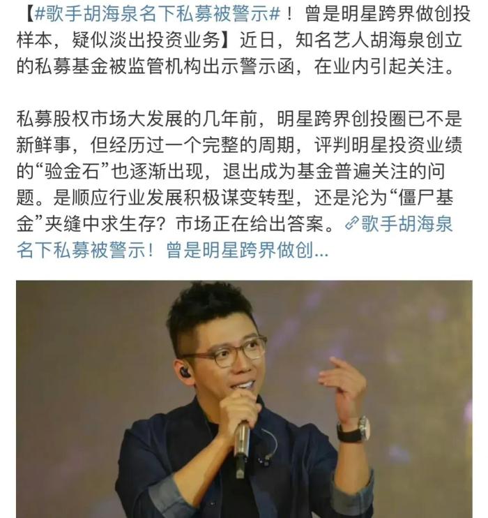 近日,歌手胡海泉因其创立的私募基金涉嫌违规被监管机构警示,引发了广泛关注和讨论。这一事件不仅暴露出明星跨界投资的风险所在,也提醒了公众对于公众人物的合法合规行为的关注。
