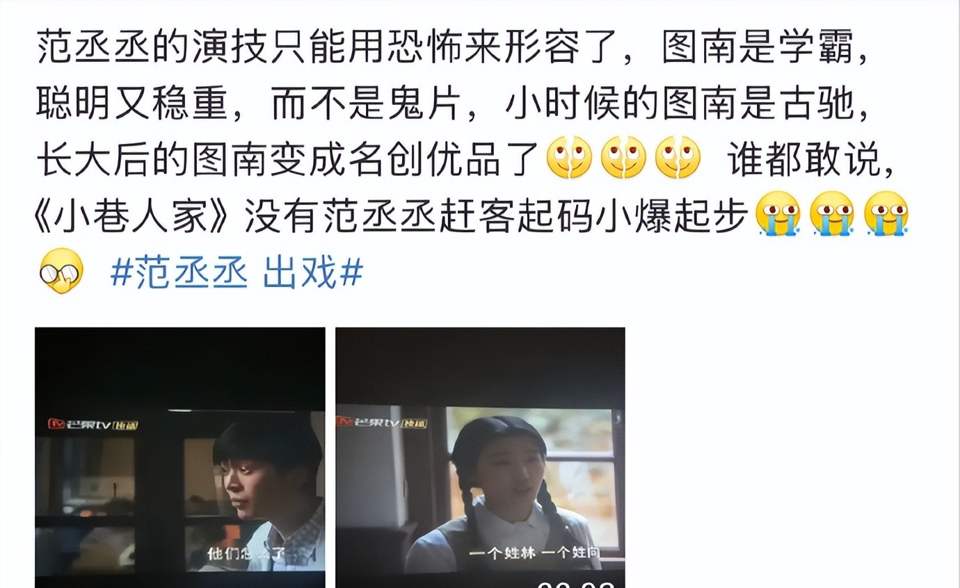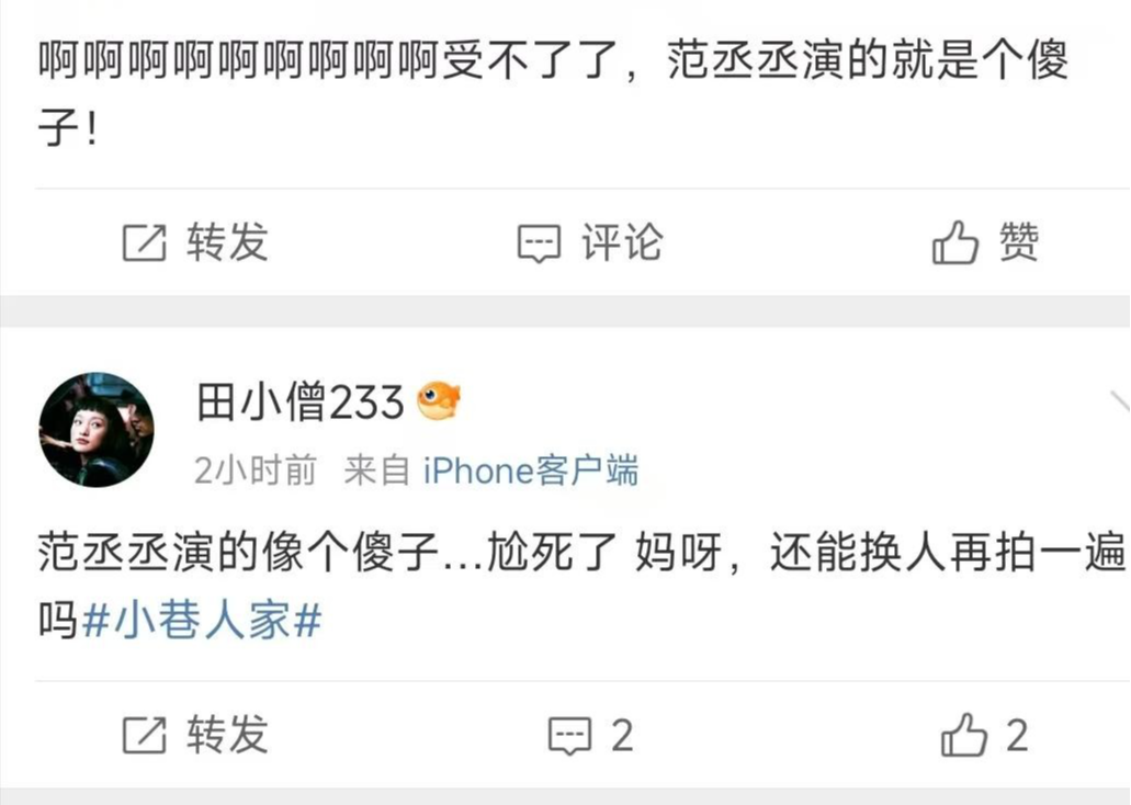 最好笑的粉丝在那儿挽尊,说《小巷人家》之所以那么火,靠的就是范丞丞的流量。