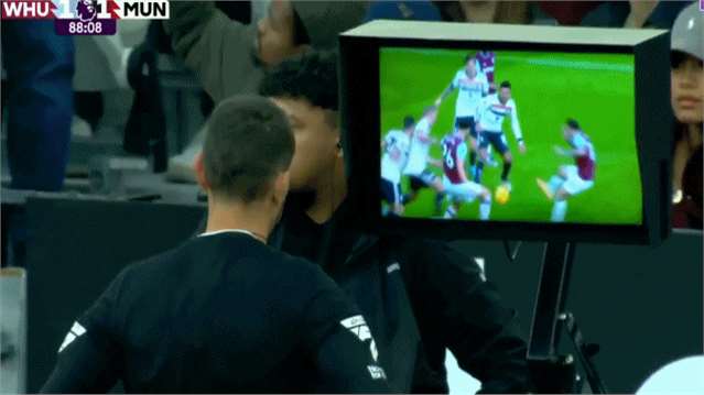 比赛进行到第88分钟,场上形势依然胶着。曼联在禁区内与西汉姆联展开了一场激烈的头球争抢。此时,德里赫特与对方前锋英斯在禁区内争抢球权,随后英斯倒地。这一幕引发了场上的争议,一开始当值主裁并没有判罚点球,但随后VAR(视频助理裁判)介入。