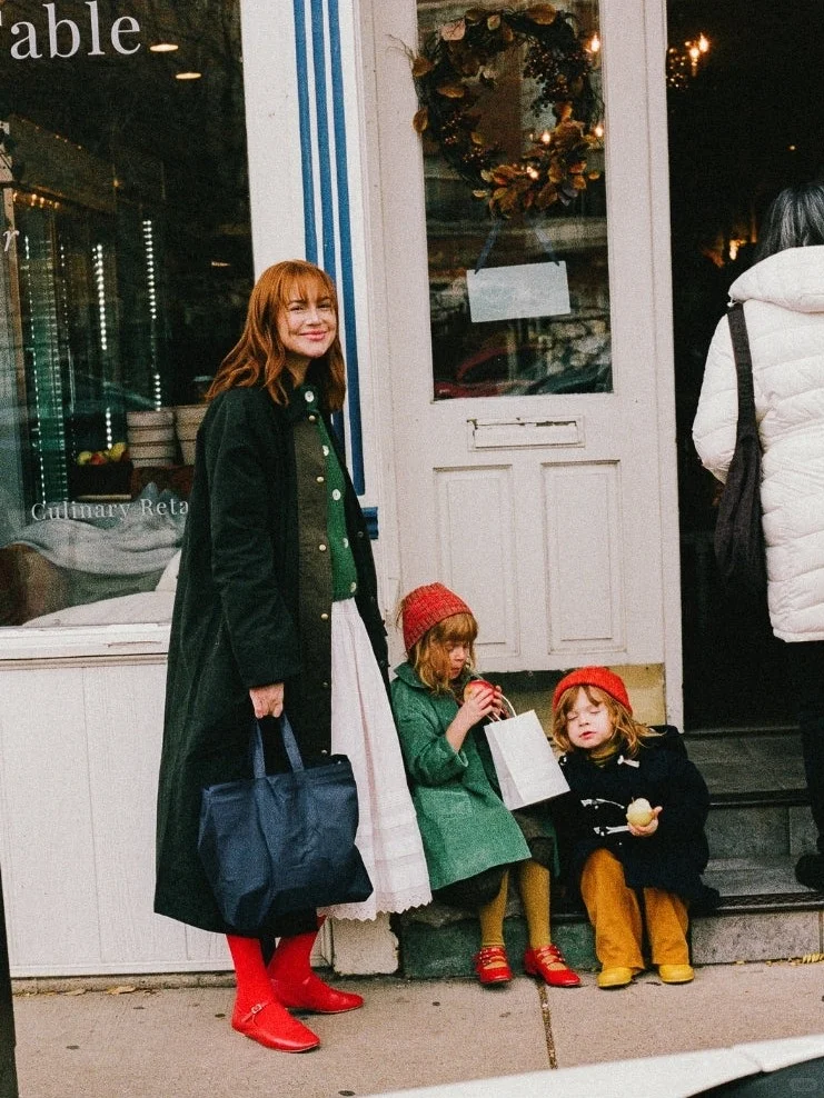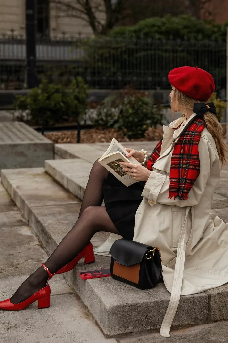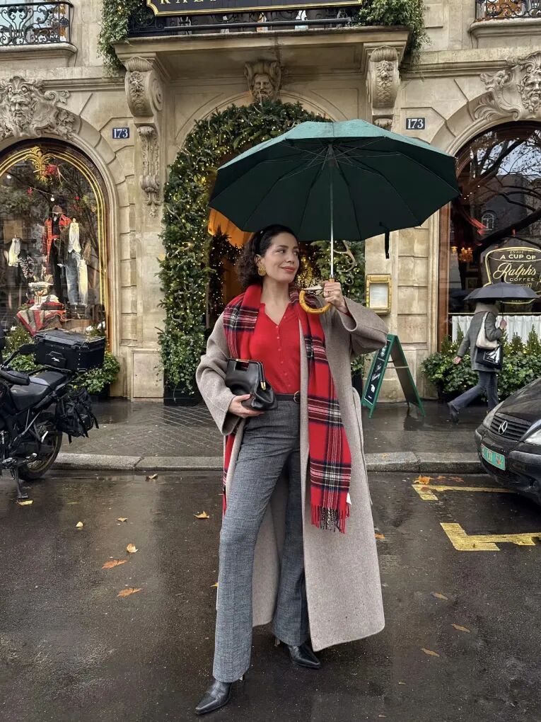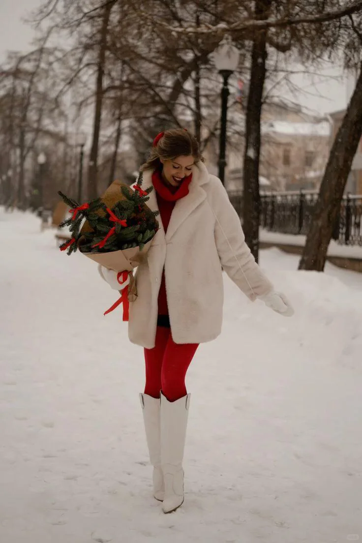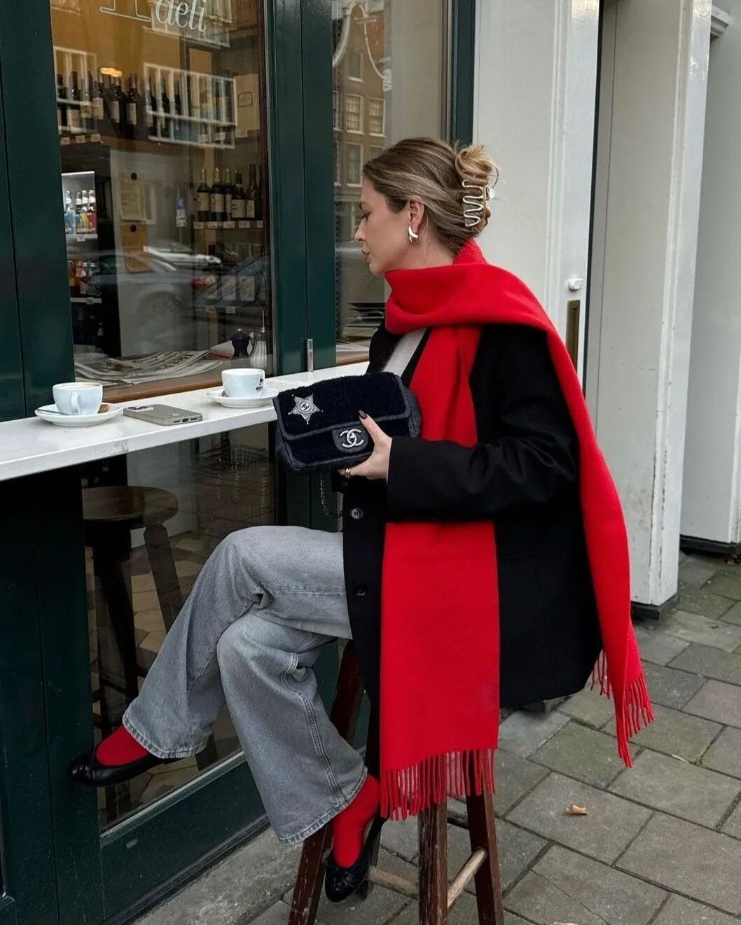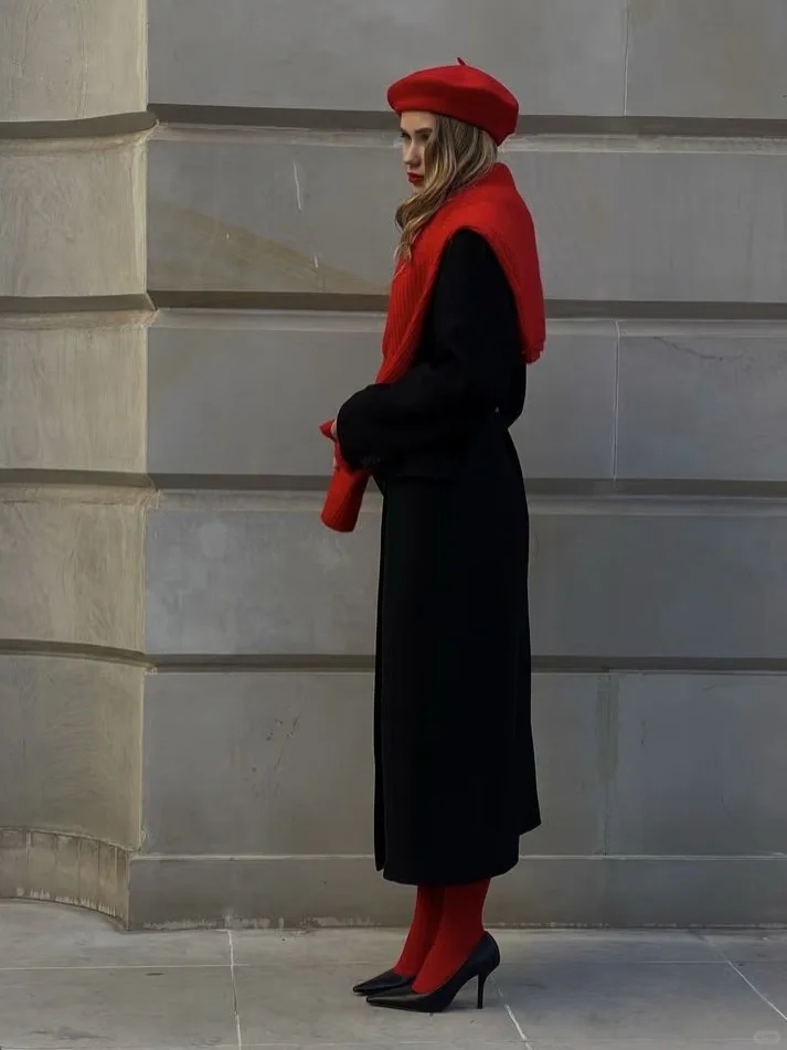 拒绝大面积撞色的浮夸,用 “小面积呼应” 拿捏高级感。一件红色围巾、披肩、帽子,与红色袜子呼应,外搭黑色毛呢外套,像圣诞卡片里的复古插画,温柔又有记忆点。
