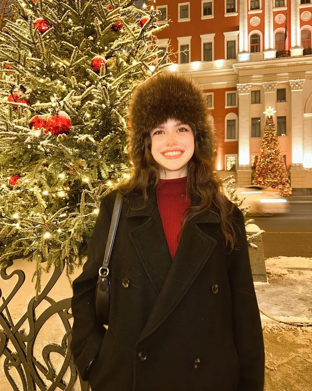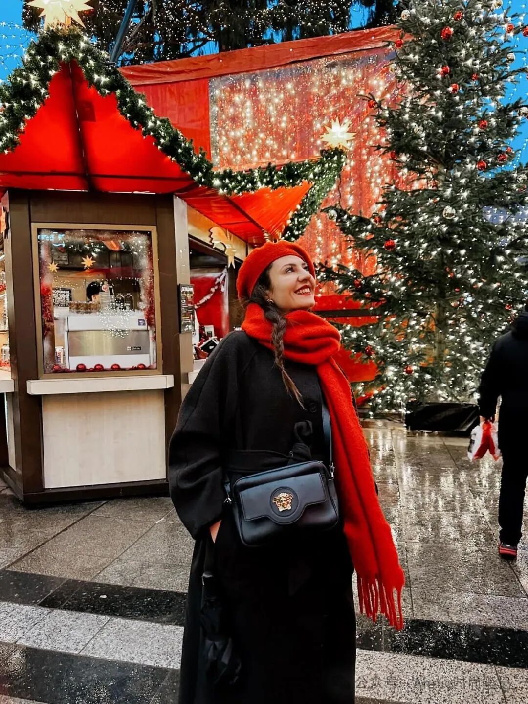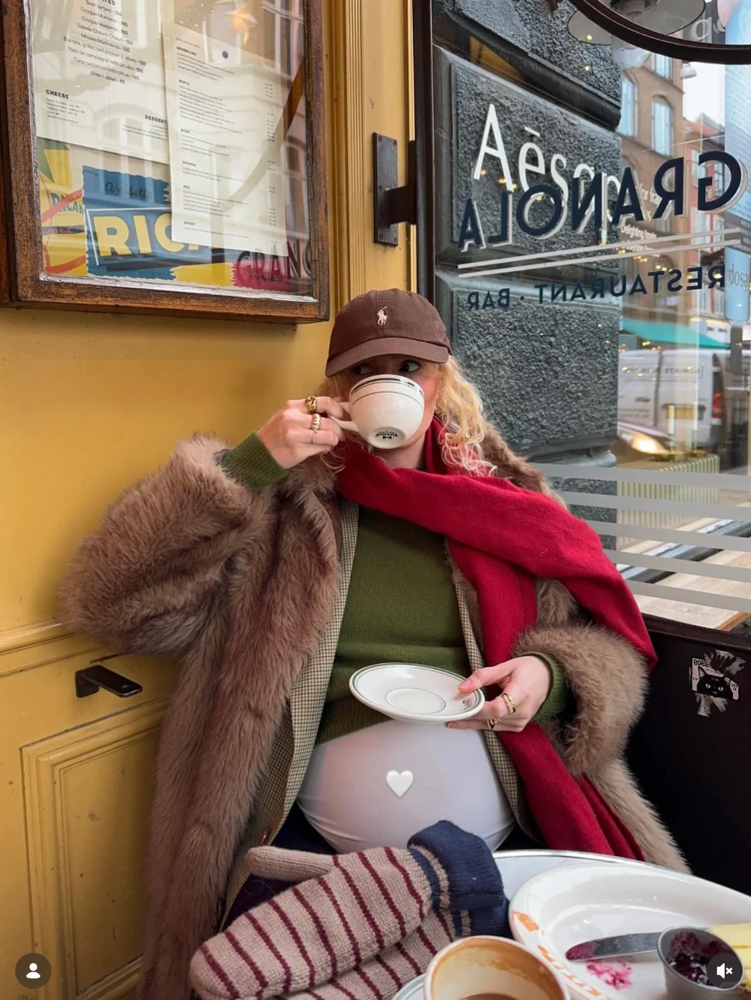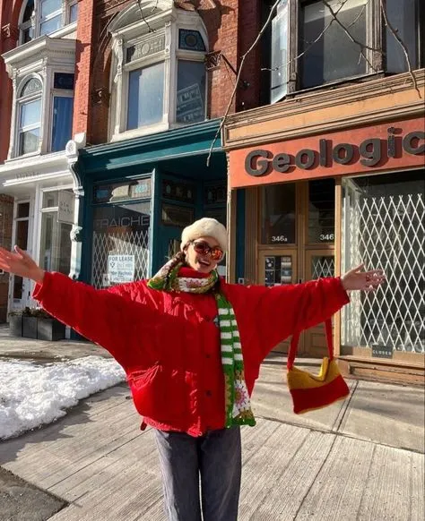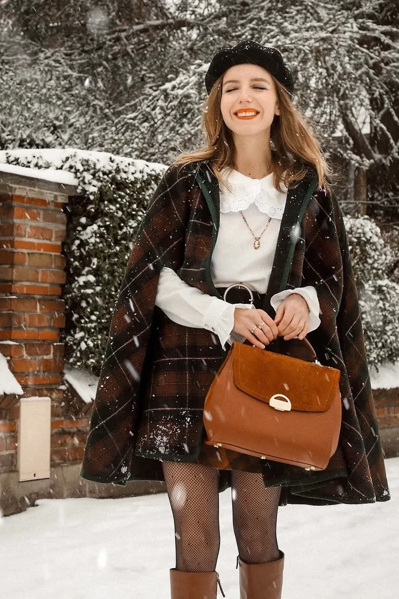 拒绝大面积撞色的浮夸,用 “小面积呼应” 拿捏高级感。一件红色围巾、披肩、帽子,与红色袜子呼应,外搭黑色毛呢外套,像圣诞卡片里的复古插画,温柔又有记忆点。