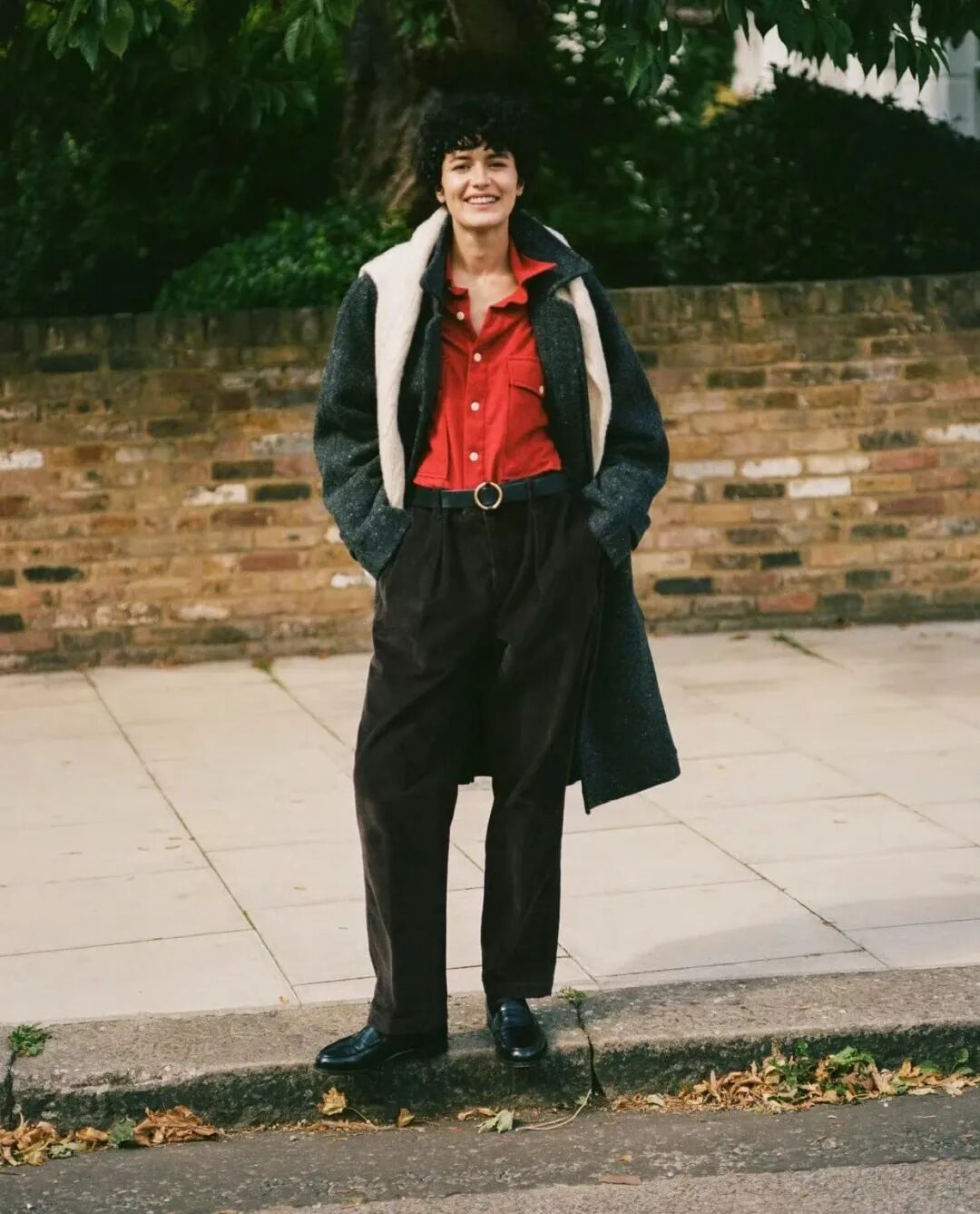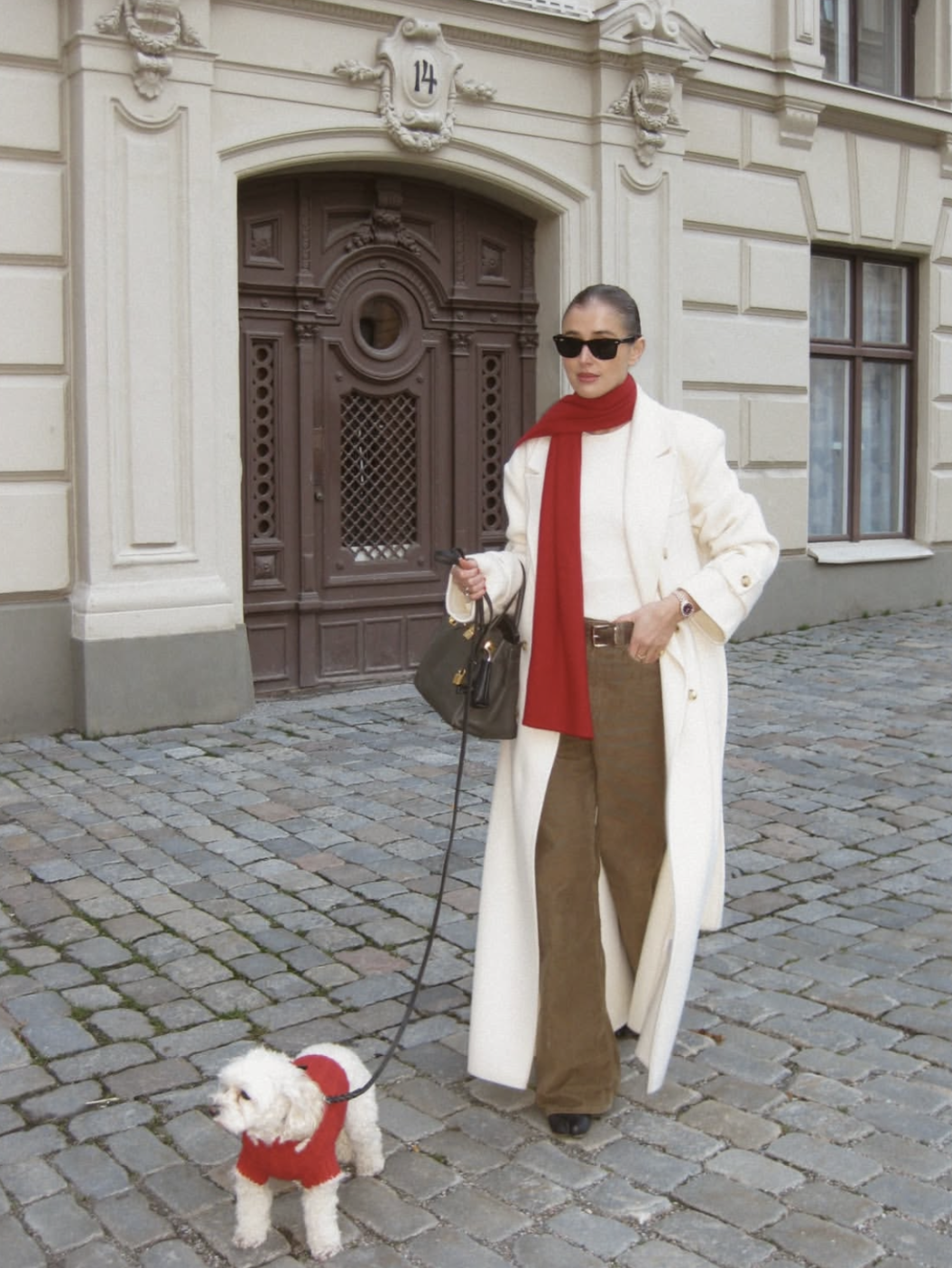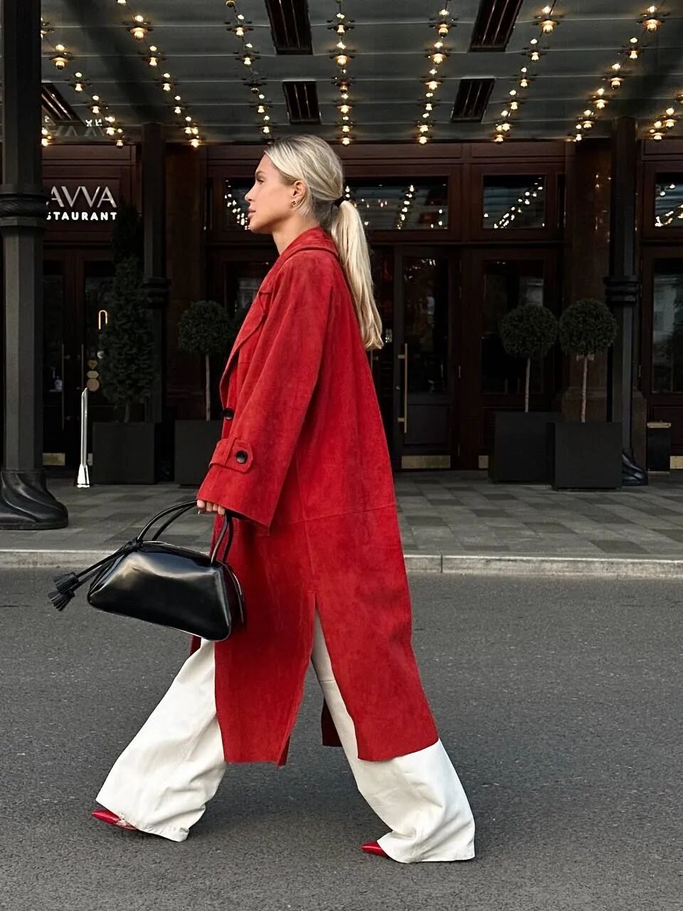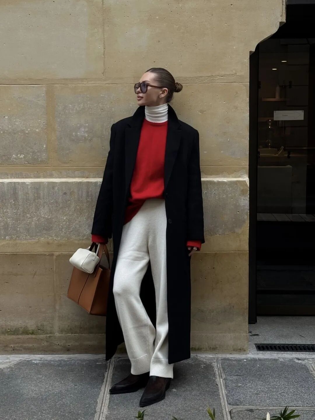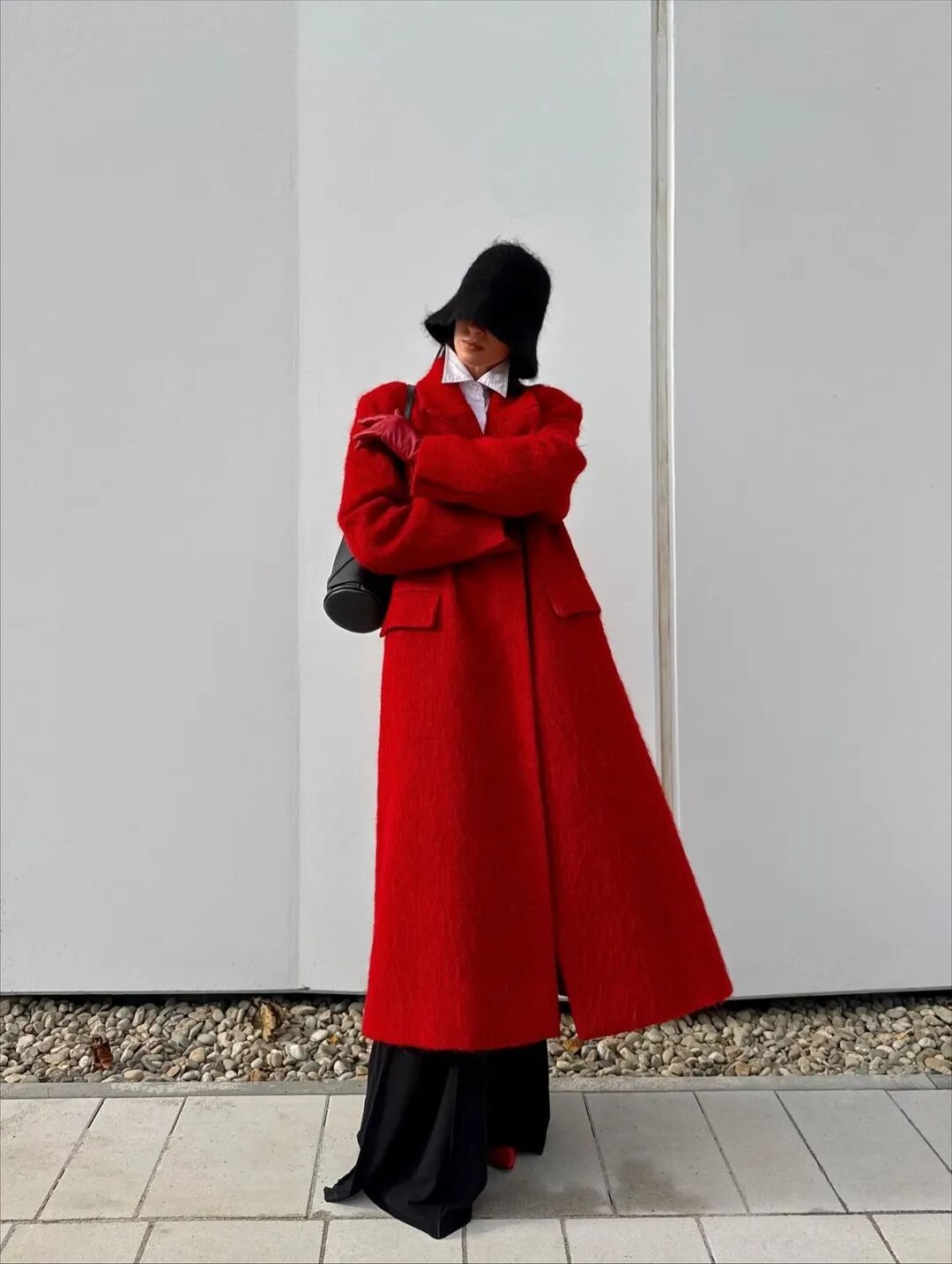 红色大衣是是利落的直筒H型,内搭白色毛衣,不仅提供贴身的温暖,更是衬托红色,下装选择一条垂坠感一流的白色阔腿长裤,与毛衣形成流畅的顺色延伸,在视觉上无限拉长身形。或是配一条裙子,随着步伐流动,与大衣的庄重形成一种动态平衡,飒爽至极。