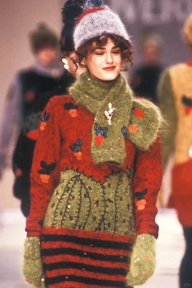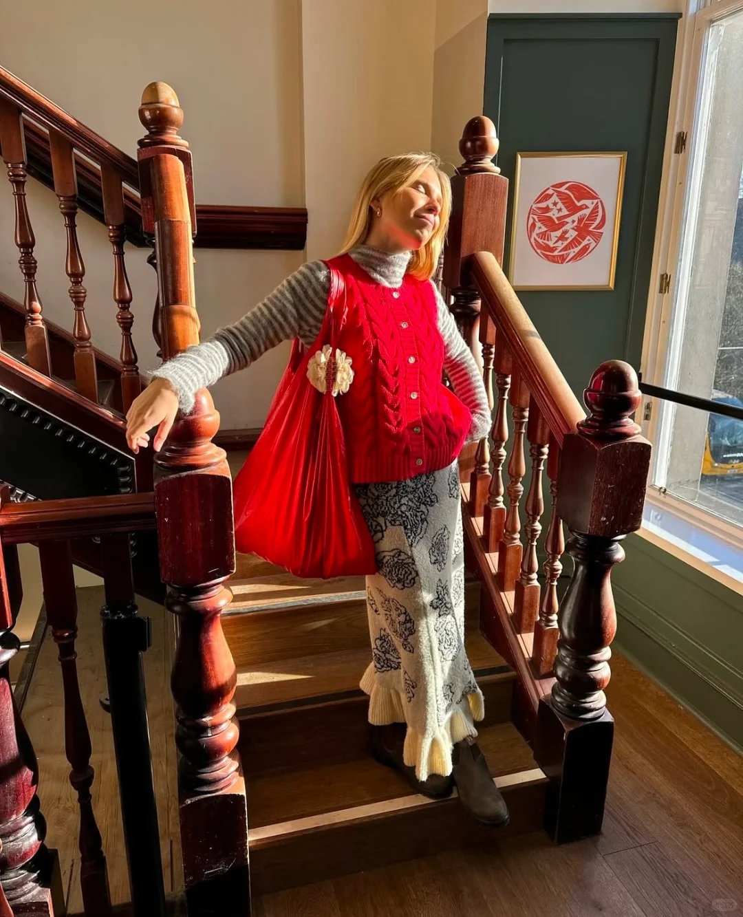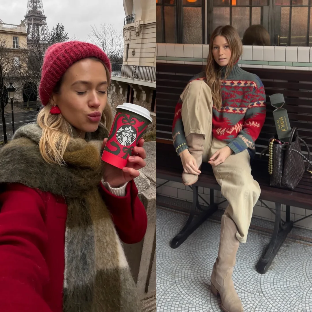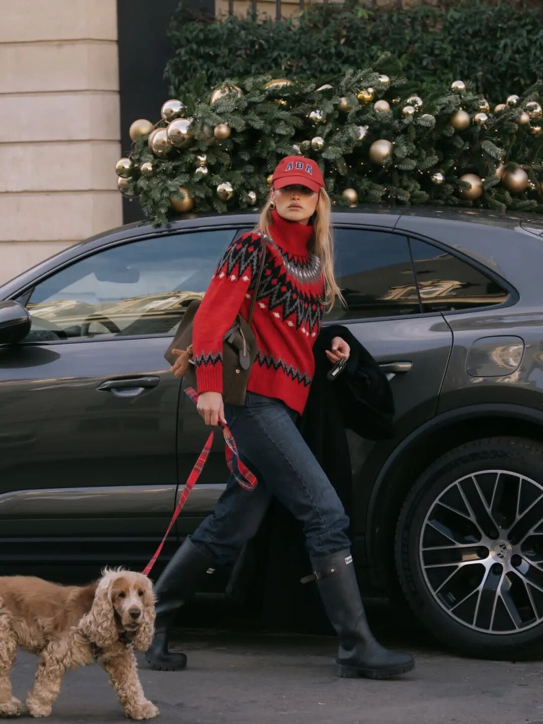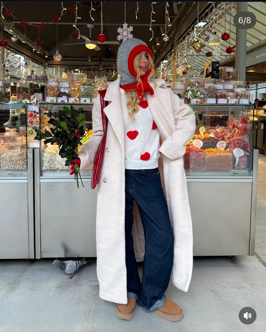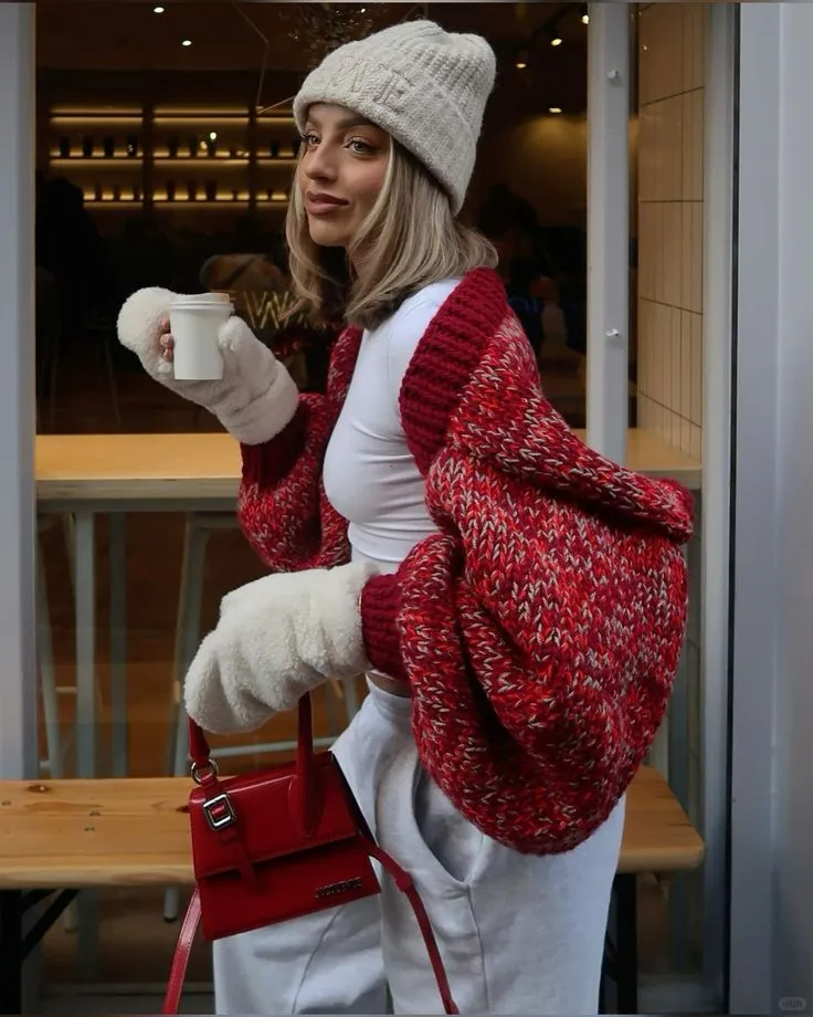 可以选择红白交织的印花毛衣,有了白的中和,让色彩有了呼吸感,不堆砌、不抢戏,却能在细节里藏住圣诞的浪漫。