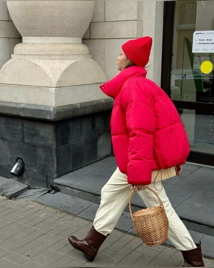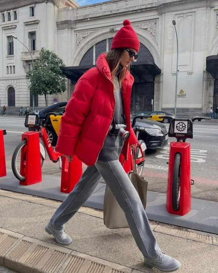 可以用红色羽绒搭配白色毛衣,白色完美衬托出红色的饱满与纯粹,下身配白色裤子、蓝色牛仔裤,巧妙地平衡了红色的张扬,注入不费力的街头活力,整套造型瞬间松弛下来。