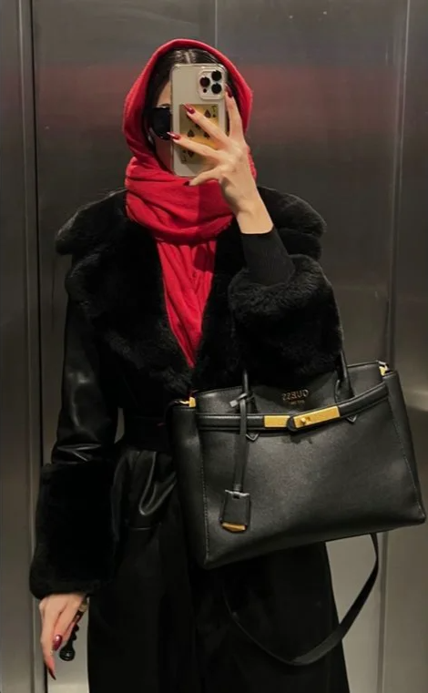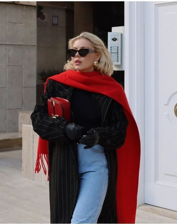 大面积黑色+小面积红色的组合很保险,不妨用黑色大衣+红色毛衣,黑色大衣+红色围巾,黑色大衣+红色包包+红色鞋子,大面积黑作为“画布”,能完美衬托红色单品的质感。