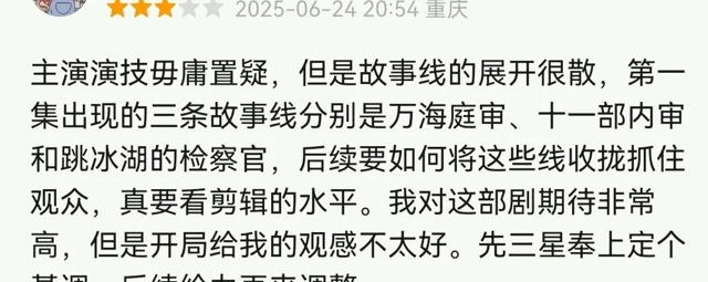 看完3集,翻了一下网上观众们对该剧的评价,可谓有褒有贬,批评多集中在第一集的剧情,认为蒋欣怼张译太过,还有觉得第一集剧情太稀碎太乱的,但多数评价,都对该剧给予了好评,并且对后面的剧情非常期待。