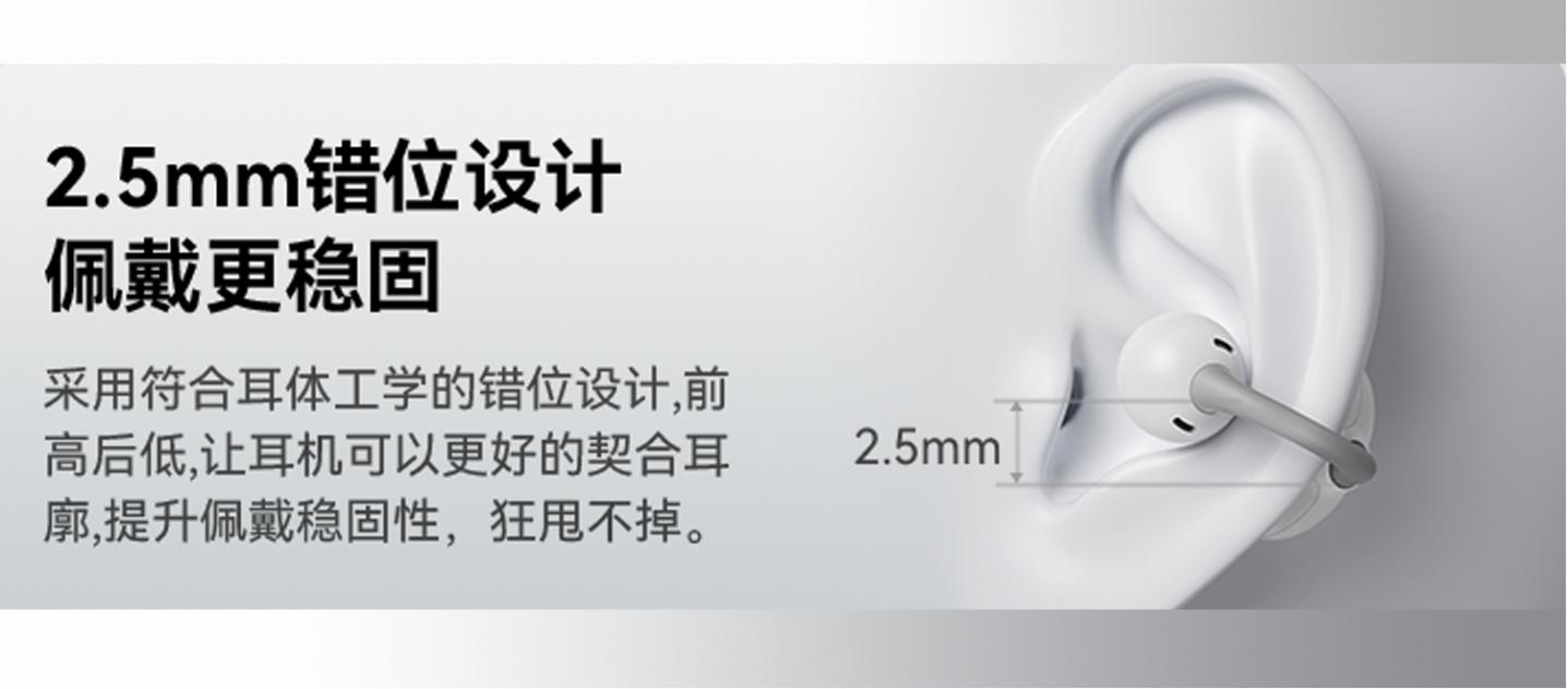 这款耳机在佩戴方面也挺有意思的,耳机的2.5mm 错位设计做成前高后低的样子,使得佩戴更加牢固。12 度弧面耳托能给耳朵提供一个合理的支撑,贴得严实,单耳才 4.5g,非常轻盈,戴着很舒服。