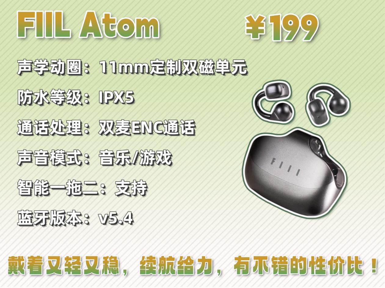 FIIL Atom售价:199元推荐理由:戴着轻松,续航也够用,日常使用完全不担心,性价比不错。