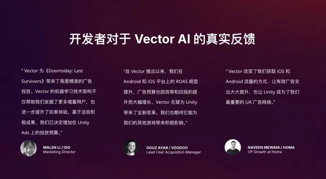 事实上,在此次大会之前,Vector就已经引发了游戏行业出海玩家们的重点关注。此时的全球游戏出海市场,移动互联网流量成本持续走高、买量数据门槛不断提升,不少出海团队面临着“获客质量不稳定、广告投放精准度不足、ROI(投资回报率)回收难”的挑战。而 Unity 通过其在游戏行业拥有的独特优势,能够同时覆盖游戏开发与用户增长两大领域,Unity Vector自今年5月正式发布以来,通过全面洞察玩家特性、游戏内容以及二者之间的交互关系,并结合持续的人工智能技术创新以及 Unity “透明化” 的核心理念,使得Unity广告客户的反馈效果大幅提升,安装和购买转化率普遍实现了15%-20%的增幅。