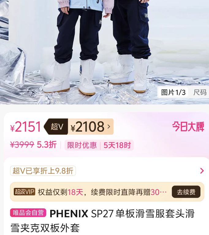 这时候,折扣渠道就显得很顺手了。像特卖电商唯品会这类平台,吃到的正是“装备消费”这波增量。平台数据就能说明这个趋势,雪季以来,唯品会上滑雪服销量同比翻倍,Phenix、HALTI这类国际专业品牌的关注度被明显拉高。