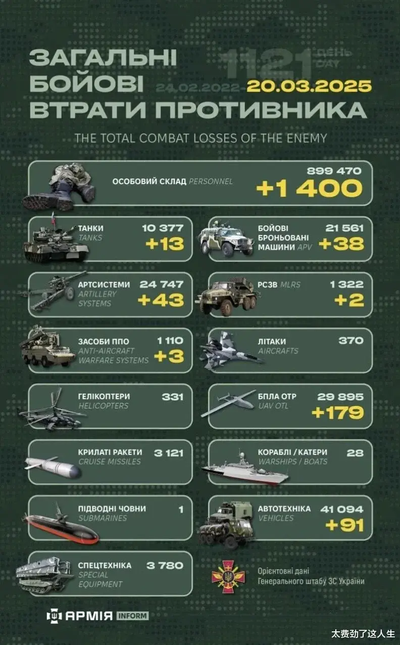 3月20日,乌克兰总参谋部公布过去24小时俄军战损:损失1400俄兵,俄军伤亡人数即将突破90万大关。
