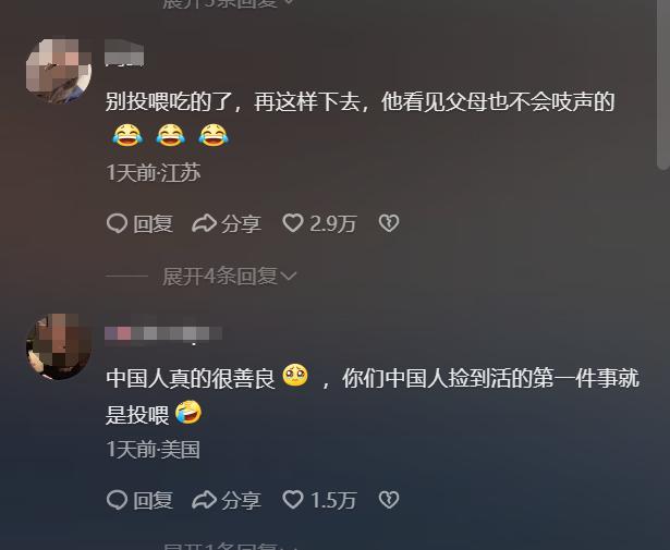 还有一个网友说:别投喂吃的了,再这样下去他看到父母也不会吱声的……
