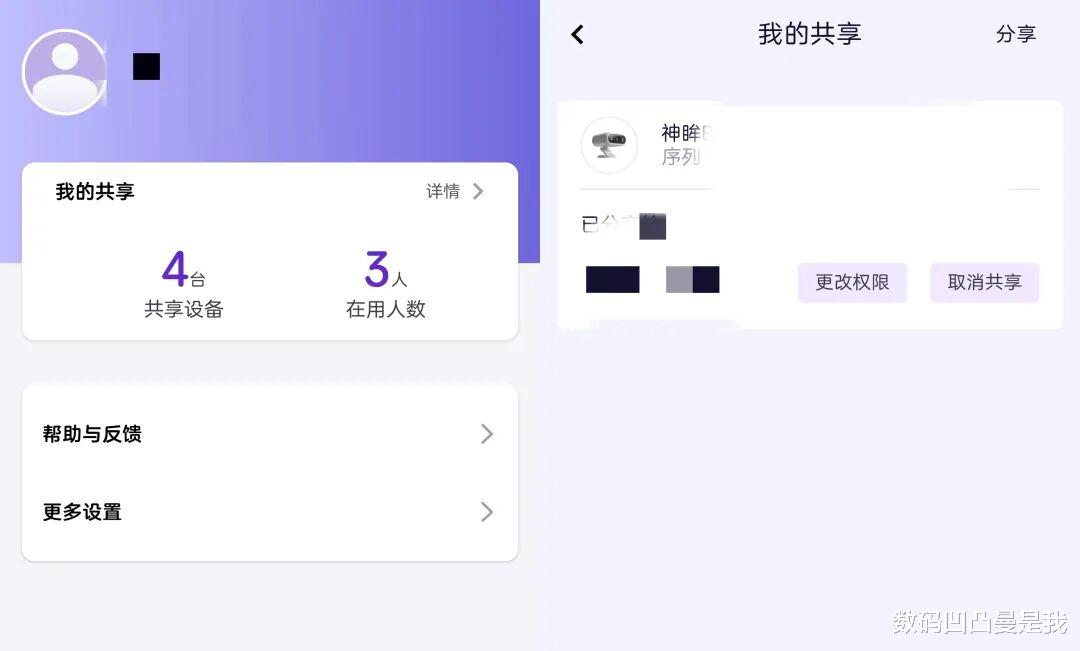 除了看重神眸BC7免插电、无需WIFI的特点,神眸APP的功能体验感觉也不差,比如想多人查看同一监控的画面,可以分享设备也能设置权限,iPhone和安卓手机都能用。