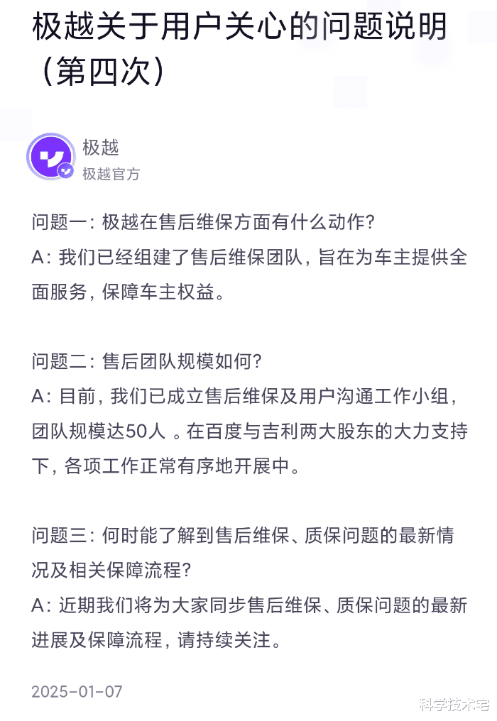 去年年底,百度和吉利联合发文称,会积极协助集度汽车(极越)来解决问题,其中包括员工的薪资、社保缴纳,还有汽车的售后问题;吉利高管发文表示,极越汽车可以去领克售后;不过考虑到目前极氪和领克已经合并,车型的数量还是比较多的,再加上极越这种“小众车型”,领克的售后可能是要忙一阵了。