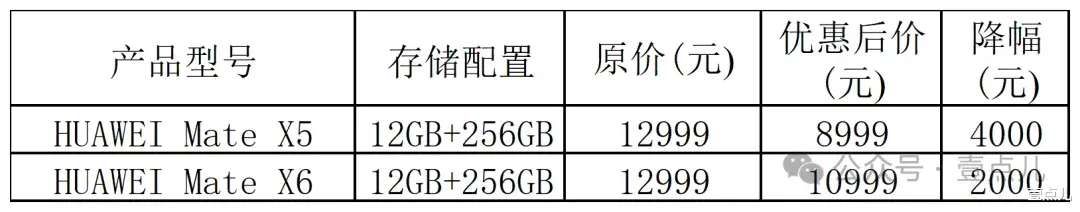 Mate X5和Mate X6两款折叠屏机型分别降价4000元和2000元。