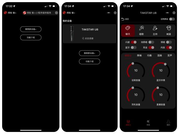 手机小程序功能: 得胜U8还支持通过手机小程序进行更精细的音效调节。我在小程序里可以自定义混响的强度、均衡器的参数,甚至还能设置自己专属的音效模式。这个功能对于追求个性化声音的用户来说真的很实用,我可以根据不同的歌曲和场景,调出最适合自己的声音效果。