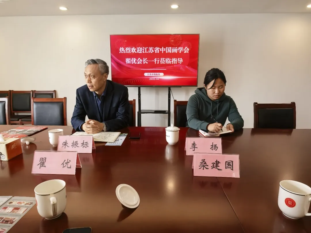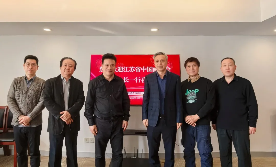 4月1日,中国画学会副秘书长、江苏省中国画学会会长翟优,学会党支部书记张广才,副会长桑建国、韩非一行,受邀前往江苏省档案馆开展交流参访活动。江苏省档案馆征集处处长朱振标热情接待到访一行,陪同参观并主持座谈交流,双方围绕“艺术存史、文化惠民、红色传承”核心议题展开深度研讨,共同探索艺术与档案事业融合发展的创新路径。