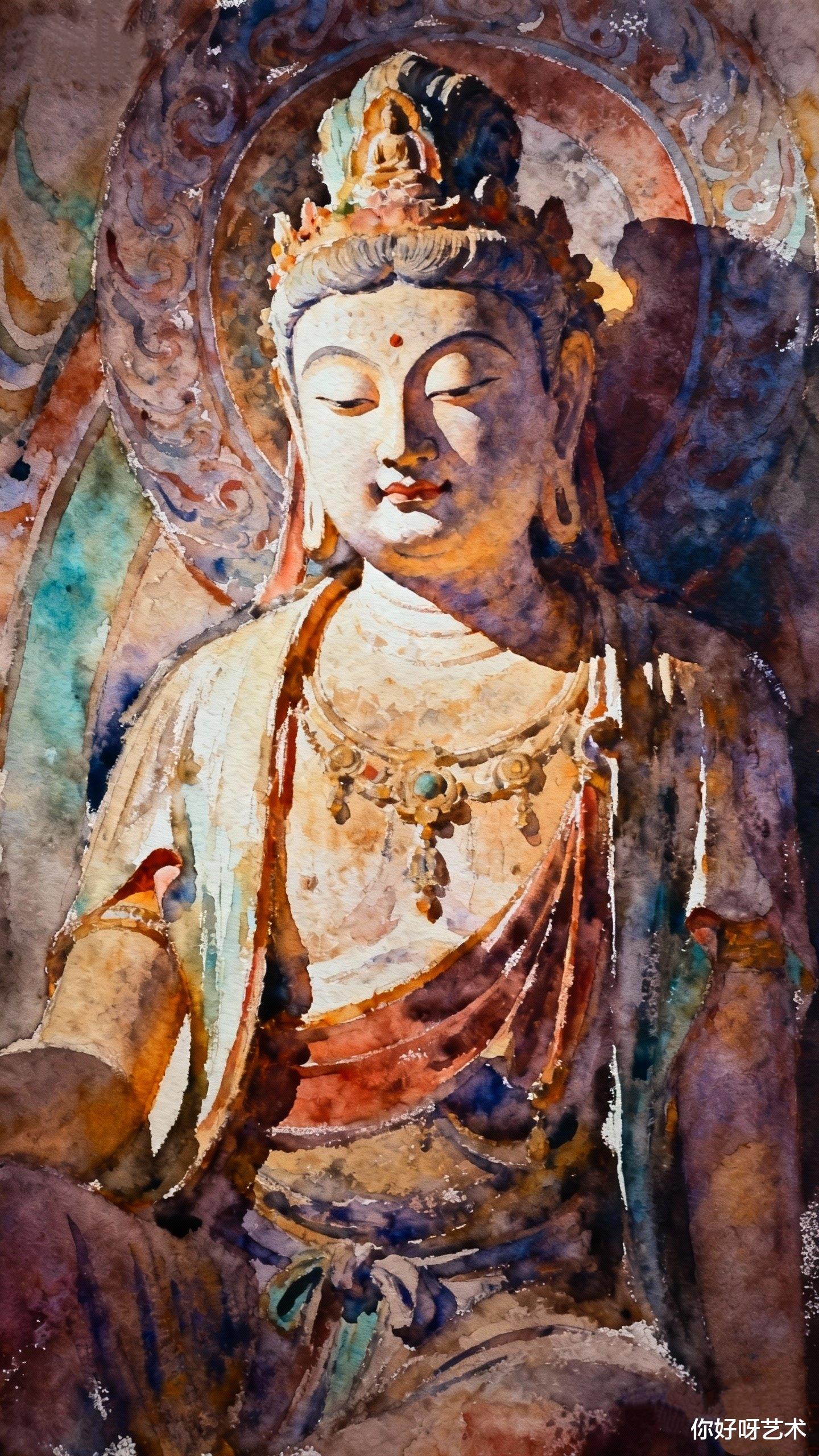 画毕,我退后三步端详。这尊水彩佛像没有金身的辉煌,却多了几分人间烟火气。它的色彩会随着光线变化,时而明媚如春,时而沉静如夜,恰似佛性的多面。我忽然想起禅宗公案中"见山是山"的三境界,这画中的佛像,或许正是我心中佛性的投射。