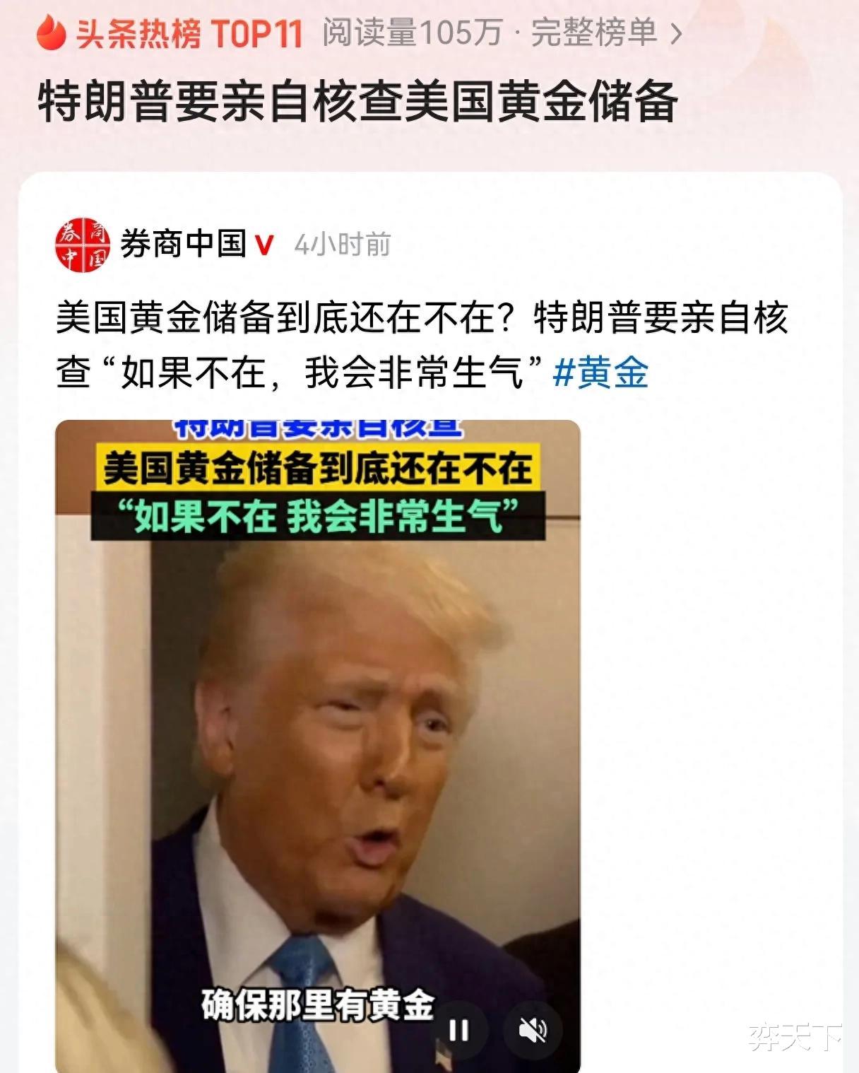 之所以质疑,依然得益于“马斯克方法”。稍早之前,马斯克在社交媒体上发帖说他在“寻找诺克斯堡的黄金”,称希望所有的黄金都在那里。特朗普称,“我要去检查诺克斯堡的黄金”。真真假假,虚虚实实,不可不信不可全信,黄金价格升高,其实也是特朗普关税大棒的结果。黄金价格升高后,“寻找诺克斯堡的黄金”就尤为重要。这是不是向军方开刀的信号?