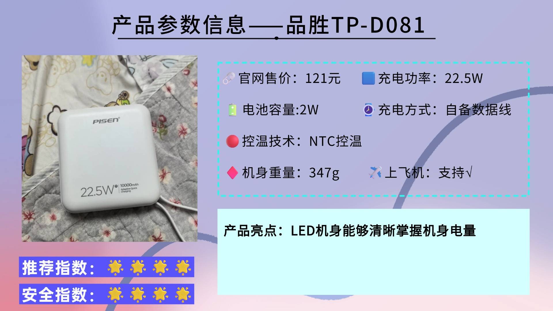 推荐理由:这款品胜 TP-D241 充电宝,单看外观还挺吸睛的,半透明机身能直接看到剩余电量,不用瞎猜该不该充电。尺寸是长 113.5mm、宽 70mm、高 28mm,净重 319g,20000mAh 的容量,额定容量 12000mAh,给手机充个两三次基本就见底了。