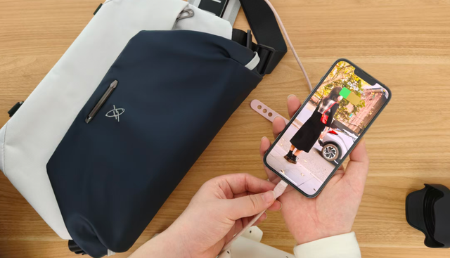 包包的内部设计上。还有一个非常值得点赞的点在于我们日常把我们的充电宝放进包体内部,可以直接连接他的100W 快充线材到包体的接口上,这样我们的包包和充电宝就变成一个整体。