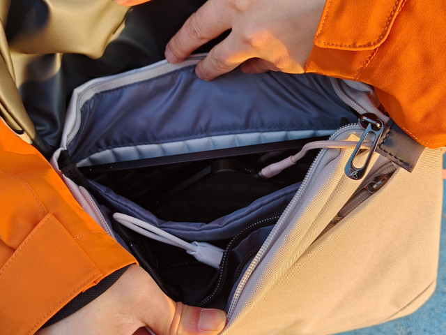 平板区域之外,旁边的空间我们日常可以放一些充电宝,大疆Pocket3的电池,耳机啥的,安全收纳之余,在我们找东西的时候还能直接顺手拿到,不用在包里翻来翻去的,这一点确实值得点赞。