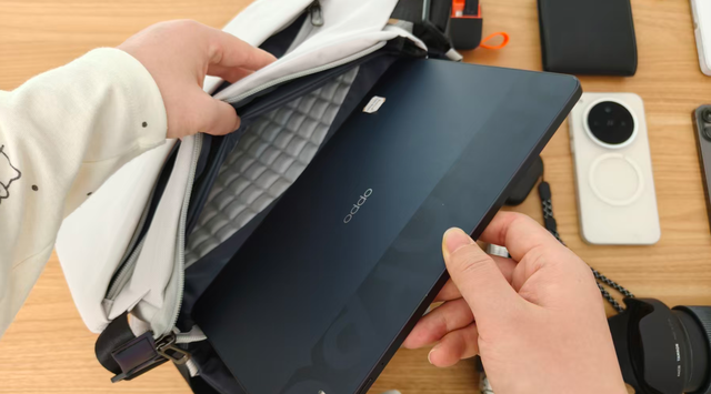像我们的平板日常放置在这么一个通勤斜挎包中,凭借着其内部空间的隔层设计以及防震气垫贴在两侧,出门在外,无论是奔跑还是赶车都是非常安心的,因为不用担心平板的屏幕会受到磕碰。