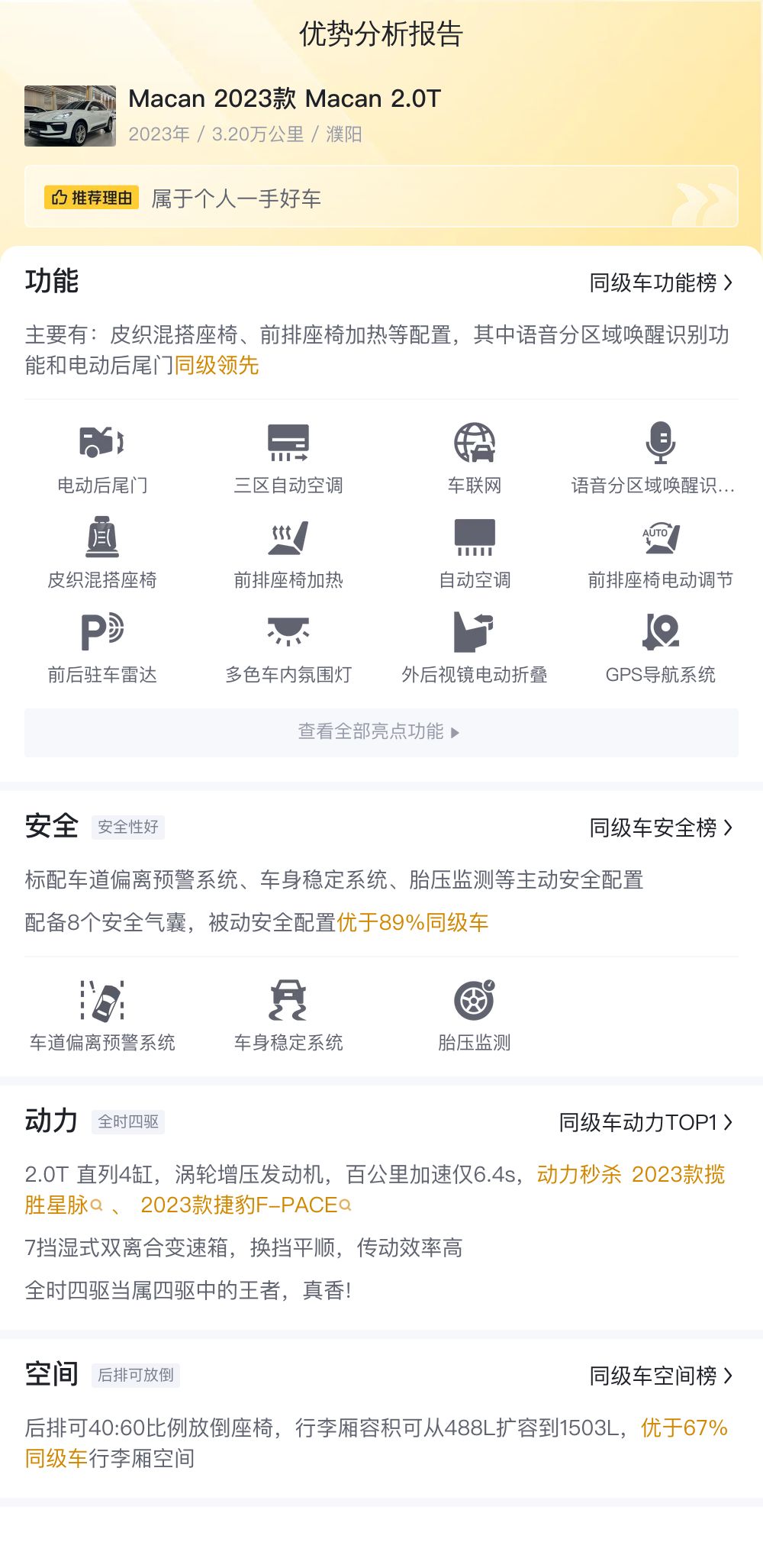 Macan作为保时捷家族的一员,动力自然是不会差!这辆Macan搭载了2.0T 直列4缸,涡轮增压发动机,百公里加速仅6.4s,7挡湿式双离合变速箱,换挡平顺,传动效率高,全时四驱当属四驱中的王者,真香!