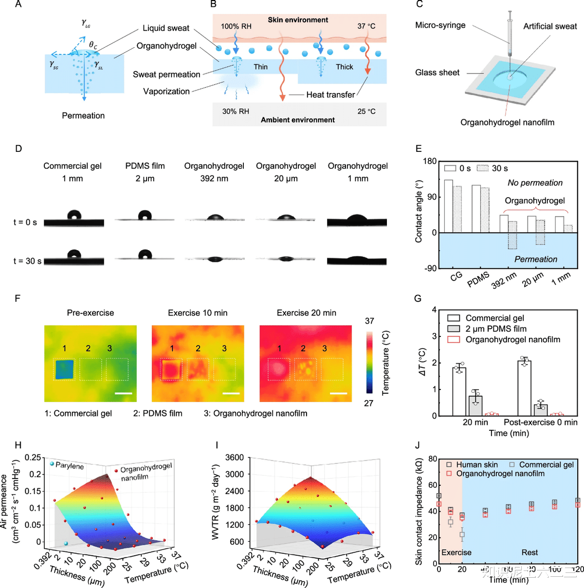 在可穿戴生物电子领域,“贴肤舒适”与“环境耐受”似乎一直是难以调和的矛盾。传统水凝胶电极要么在日常活动中透气差、易脱落,要么在极端温湿度下性能崩溃。而近期发表在《Nature Communications》上的一项研究,成功打破了这一僵局 —— 研发出厚度仅 392nm 的有机水凝胶纳米膜表皮电极,既像第二层皮肤般贴合舒适,又能在 - 80℃~150℃、2% 低湿度甚至真空环境中稳定工作,连续 9 天精准捕捉心电图信号。