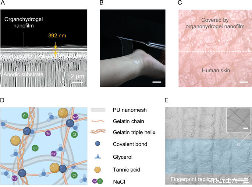 电极采用聚氨酯(PU)纳米网增强的京尼平交联明胶基质,经甘油 / 氯化钠 / 单宁酸电解质塑化而成,厚度仅 392nm。这种超薄设计带来了极低的弯曲刚度(8.7×10⁻¹¹ nN・m),远低于人体角质层和真皮层,能完美贴合皮肤纹理甚至指纹轮廓,日常活动中可随皮肤褶皱自由形变。