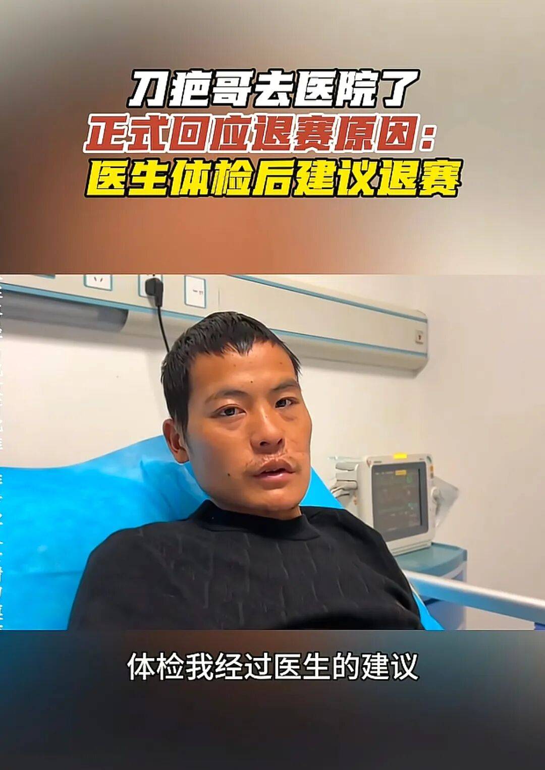 退赛后,刀疤哥直播回应退赛原因:“肠胃这几天有很大的变化,医生来体检过,据医生的建议决定下山,很遗憾这次。”