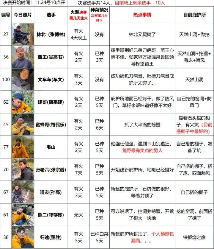 目前还在比赛中的选手除61号选手“熊二” (本名祁存栋)以外均已生起火。