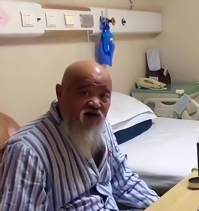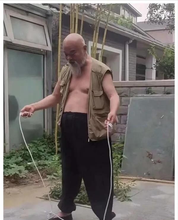 照片中的他虽然穿得比较年轻时尚,但手中的拐杖和白胡子却让70岁的他看起来像90岁的农村老头。