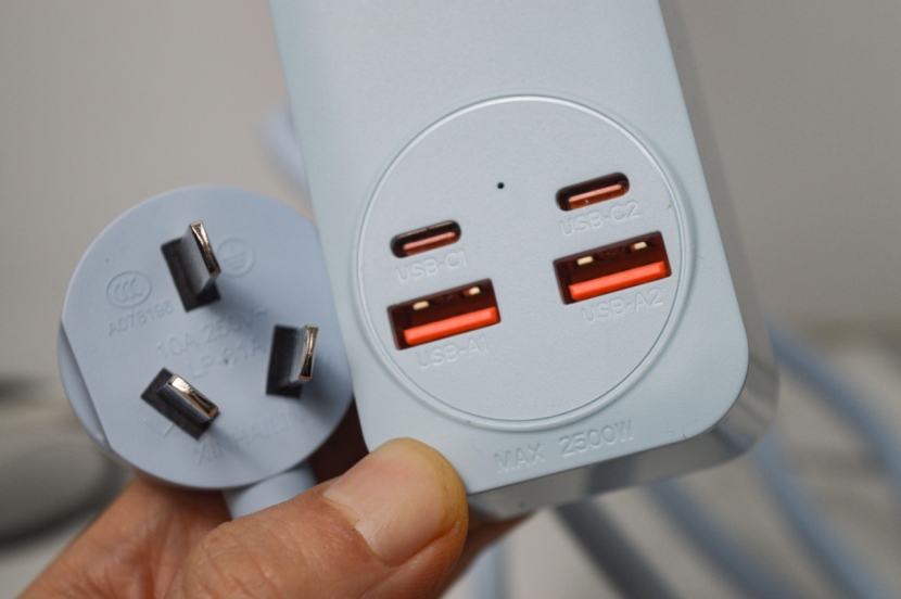 此外,三个新国标五孔AC插座采用宽间距设计,即使插入大型笔记本电源适配器,相邻孔位仍可正常使用,彻底告别插头“打架”的时代。