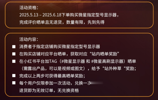 用户完成国家补贴后,参与微星双重晒单活动:站内晒单:在微星指定电商平台(天猫/京东旗舰店等)完成订单评价,即享30-50元基础返现。