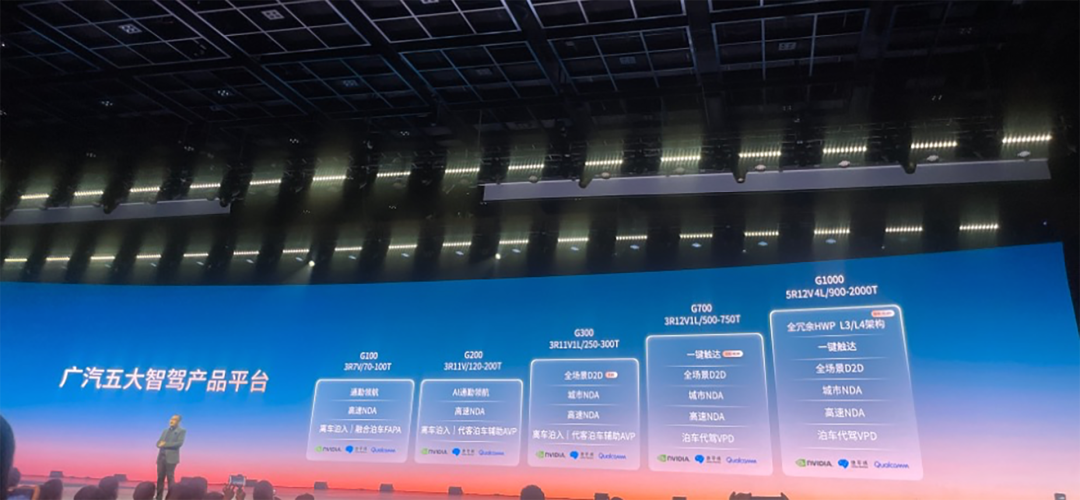应用层面,广汽将推出五大智驾产品平台。具体来看,G100平台覆盖通勤领航、高速DNA及融合泊车(包括离车泊车);G200平台覆盖AI通通勤领航、高速DNA及AVP代客泊车;G300覆盖D2D全场景、城市DNA、高速DNA及AVP代客泊车;G700覆盖一键触达、D2D全场景、城市DNA、高速DNA及VPD泊车代驾;G1000则跨入L3、L4自动驾驶级别。